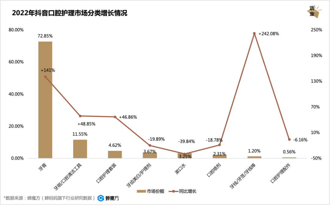 这一赛道在去年收获了飞速增长,以抖音为例,2022年口腔护理市场同比增长82.14%,品牌们纷纷发起对这一增量市场的进攻。