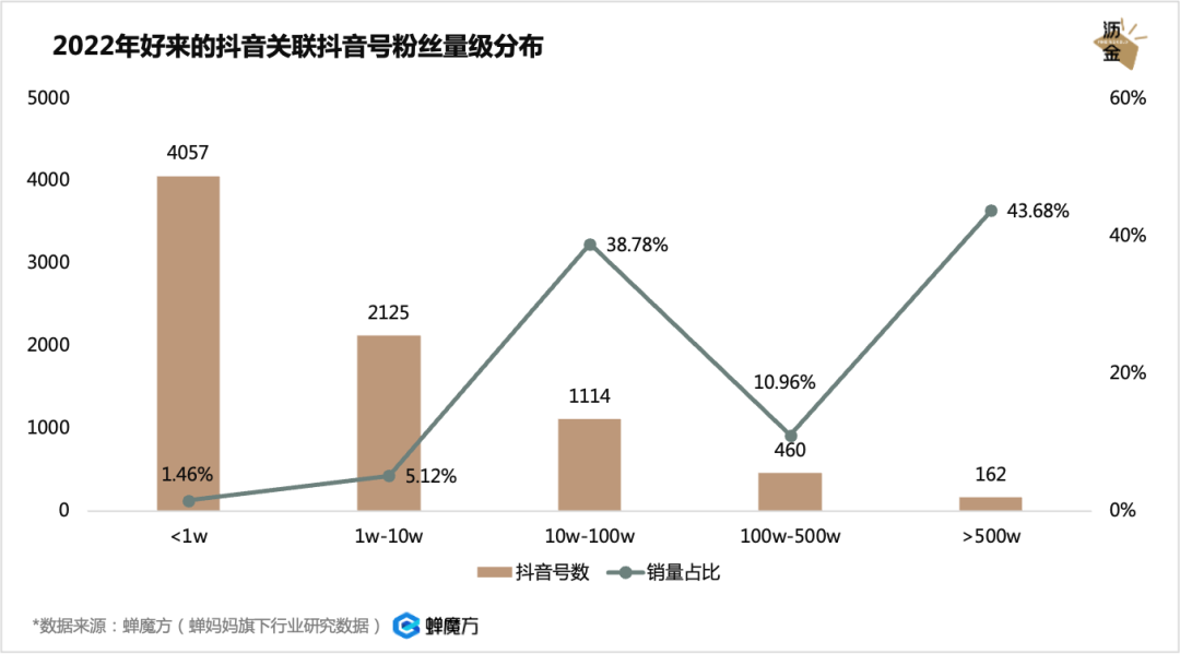 在抖音一侧的合作上,10-100万、1-10万粉丝的账号为品牌提供了大多数的销售额,分别占比64.45%和23.12%。