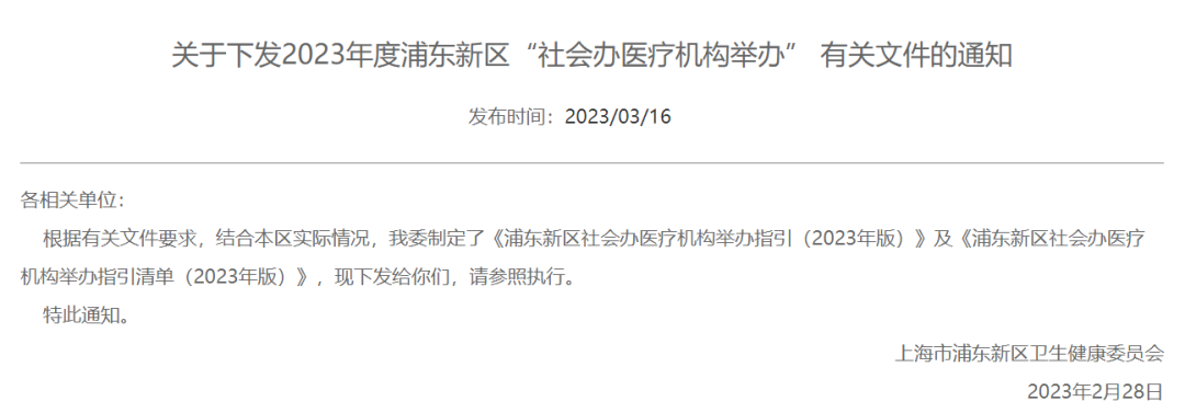就在近日,上海市浦东新区卫生健康委员会下发了《浦东新区社会办医疗机构举办指引(2023年版)》(以下简称“指引”)。